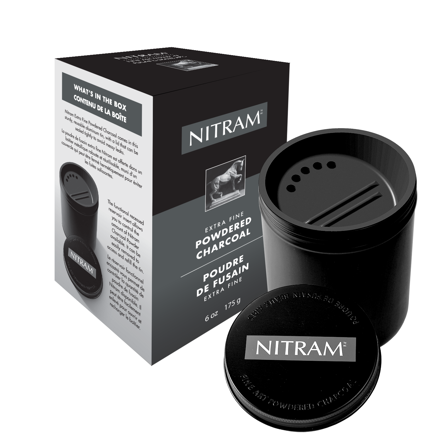 Nitram Extra Fine Powdered Charcoal comes in this sturdy, reusable aluminum tin, with a lid that can be sealed tightly to avoid messy leaks.